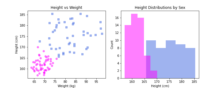 ] --- ``` ## Using virtual environment '/github/home/.virtualenvs/r-reticulate' ... ``` --- ## Data Visualization with Python Today's goals: - Introduce Python's utilities for data visualization - Learn how to customize several types of plots for publication-worthy data visualizations - Explore online documentation --- ## Workflow for Generating Figures In general, the recipe for creating a figure is as follows: 1. Generate or import the data to be plotted. This is generally a list of x values and a list of y values. 2. Import matplotlib.pyplot to have access to the library and functions 3. Generate the figure and axes 4. Plot the data on the appropriate axis or axes using functions such as `plot()`, `scatter()`, `bar()`, etc.. 5. Customize your plot using the built-in options for the function you used to plot (found in documentation). 6. Render your plot using `show()` and save or export it if you wish. ---  --- ## Matplotlib Matplotlib is Python's library for visualization. It has extensive documentation available [online](https://matplotlib.org/stable/), including many [tutorials](https://matplotlib.org/stable/tutorials/index.html). Within Matplotlib, you will mostly be working with `pyplot` to generate simple plots. You can view the documentation for pyplot [here](https://matplotlib.org/stable/api/pyplot_summary.html#module-matplotlib.pyplot). Each function within pyplot has detailed descriptions of the arguments it takes - these will be very useful when you would like to customize your plots. --- ## Importing matplotlib.pyplot To import matplotlib.pyplot, simply type `import matplotlib.pyplot as plt` at the top of your code. You can then refer to the library as `plt` in your code as needed. Note that this isn't strictly necessary, but you will find that this is an almost-universal naming convention (other libraries follow similar conventions too). ``` python import matplotlib.pyplot as plt ``` --- ## Figures, Plots, and Subplots In Python, the best way to make a figure is by using the [`subplots()`](https://matplotlib.org/stable/api/_as_gen/matplotlib.pyplot.subplots.html) function to define a figure and set(s) of axes. The reason we use the `subplots()` function is that it makes it easy to add multiple plots/axes to a figure, which is commonly done in the visualization of scientific data. To define a figure, you can write: ``` python fig, ax = plt.subplots() ``` --- ## The First Plot ``` python fig, ax = plt.subplots() ``` <!-- --> --- ## A Closer Look ``` python fig, ax = plt.subplots() ``` - `fig` is your figure (think: shape and size of your plot) - `ax` is your set of axes where you will plot your data and customize how the plot looks - You can have multiple axes in a single figure (which we will see later) - [`subplots()`](https://matplotlib.org/stable/api/_as_gen/matplotlib.pyplot.subplots.html) is a function which has multiple arguments that you can use to specify the size and shape of your figure, as well as other parameters for your axes. Let's visit the [documentation](https://matplotlib.org/stable/api/_as_gen/matplotlib.pyplot.subplots.html) and take a look at the options. --- ## Figure Size - You can specify the size of the figure using the `figsize=([width], [height])` option (dimensions should be in inches based on default 100 dpi - may change depending on your monitor). - At the bottom of your code, type `plt.show()` to render your plot ``` python fig, ax = plt.subplots(figsize=(4, 3)) plt.show() ``` <!-- --> --- ## Axis Limits - You can set the limits of your x and y axes by applying the set_xlim() or set_ylim() function to your axes, ax. ``` python fig, ax = plt.subplots(figsize=(3, 2)) ax.set_xlim(-3, 4) ``` ``` ## (-3.0, 4.0) ``` ``` python plt.show() ``` <!-- --> --- ## Multiple Subplots Looking at the [`subplots()`](https://matplotlib.org/stable/api/_as_gen/matplotlib.pyplot.subplots.html) documentation again, we can see that we can specify the number and arrangement of subplots we want: - `ncols` for the number of columns - `nrows` for the number of rows You can then define a corresponding axis for each subplot. Below is the code to generate two horizontally (`fig1`) and vertically (`fig2`) stacked subplots. ``` python fig1, (ax1, ax2) = plt.subplots(nrows=1, ncols=2) fig2, (ax3, ax4) = plt.subplots(nrows=2, ncols=1) ``` --- ## Example with 4 Subplots Let's make a 2x2 grid of subplots. Note that we use nested brackets to specify the positions of each subplot within the figure. ``` python fig, ((ax_nw, ax_ne), (ax_sw, ax_se)) = plt.subplots(nrows=2, ncols=2) plt.show() ``` --- ## Arranging Subplots  --- ## Advanced Subplot Options - Other [`subplots()`](https://matplotlib.org/stable/api/_as_gen/matplotlib.pyplot.subplots.html) options: - `width_ratios` and `height_ratios` to adjust the relative sizes of rows and columns - `sharex` and `sharey` to force subplots to share an x or y axis - [`gridspec`](https://matplotlib.org/stable/users/explain/axes/arranging_axes.html) for arbitrary/custom subplots (ex: different number of plots in each row) --- ## Importing Data Now that we can make figures and axes, let's grab some data to plot. We are going to use some patient data that contains sex ('Male' or 'Female'), weight (kg) and height (cm). We will then have 3 arrays of data to work with. ``` python import numpy as np sex, height, weight = np.genfromtxt('data/height-weight.csv', unpack = True, delimiter = ",", skip_header=True, dtype=None, encoding='UTF-8') print(sex) ``` ``` ## ['Male' 'Male' 'Male' 'Male' 'Female' 'Female' 'Female' 'Female' 'Male' ## 'Male' 'Female' 'Female' 'Male' 'Female' 'Female' 'Male' 'Male' 'Male' ## 'Male' 'Male' 'Male' 'Female' 'Male' 'Female' 'Female' 'Male' 'Male' ## 'Male' 'Male' 'Male' 'Female' 'Male' 'Male' 'Female' 'Male' 'Female' ## 'Male' 'Female' 'Male' 'Female' 'Male' 'Female' 'Female' 'Female' ## 'Female' 'Female' 'Female' 'Female' 'Male' 'Female' 'Female' 'Female' ## 'Female' 'Female' 'Male' 'Female' 'Female' 'Female' 'Male' 'Ma